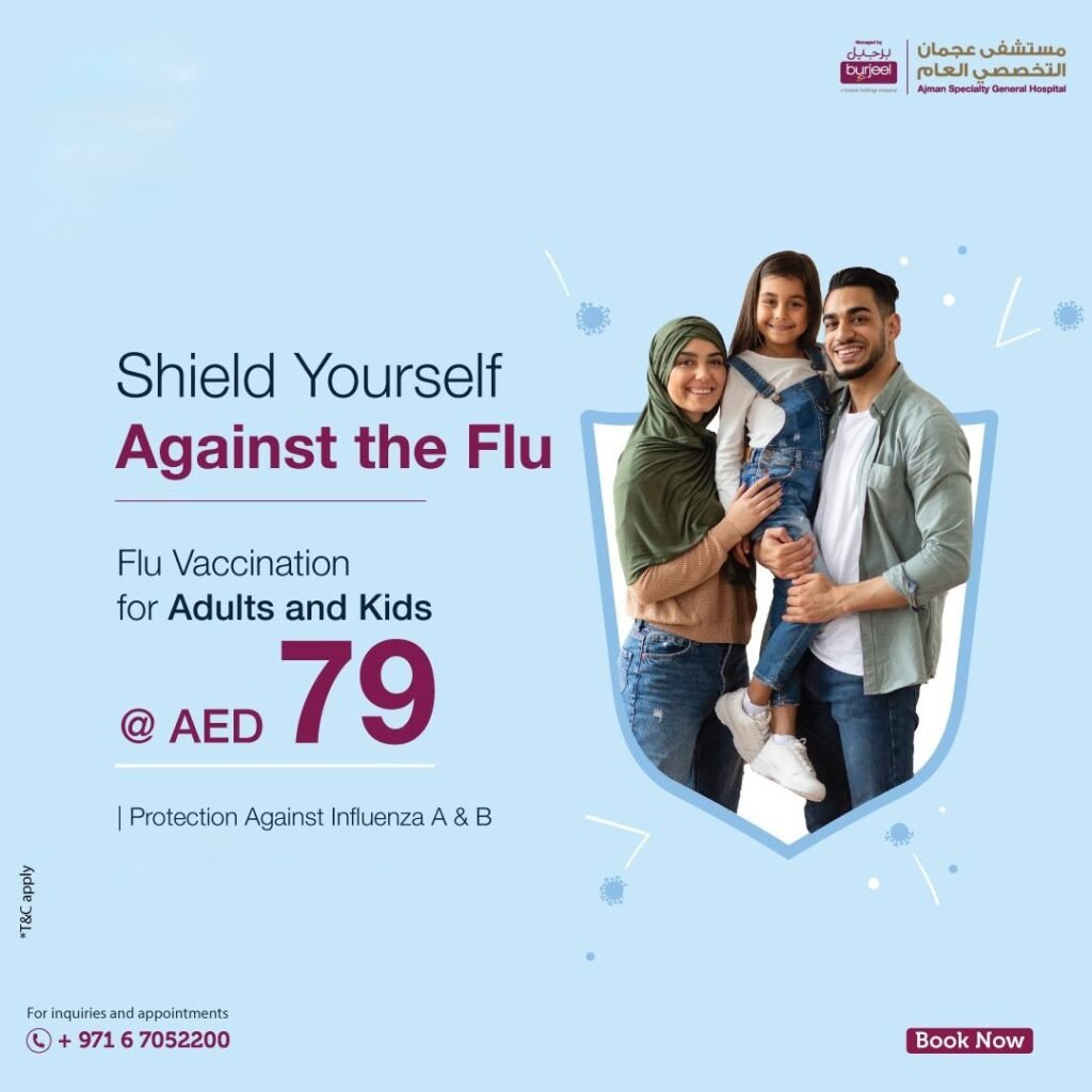 احصل على تطعيم الإنفلونزا في مستشفى عجمان التخصصي العام بسعر 79 درهمًا فقط. مناسب للكبار والأطفال، ويشمل الحماية ضد إنفلونزا A و B . احمِ عائلتك وأحباءك هذا الموسم بخدمات طبية موثوقة تضمن سلامتهم.